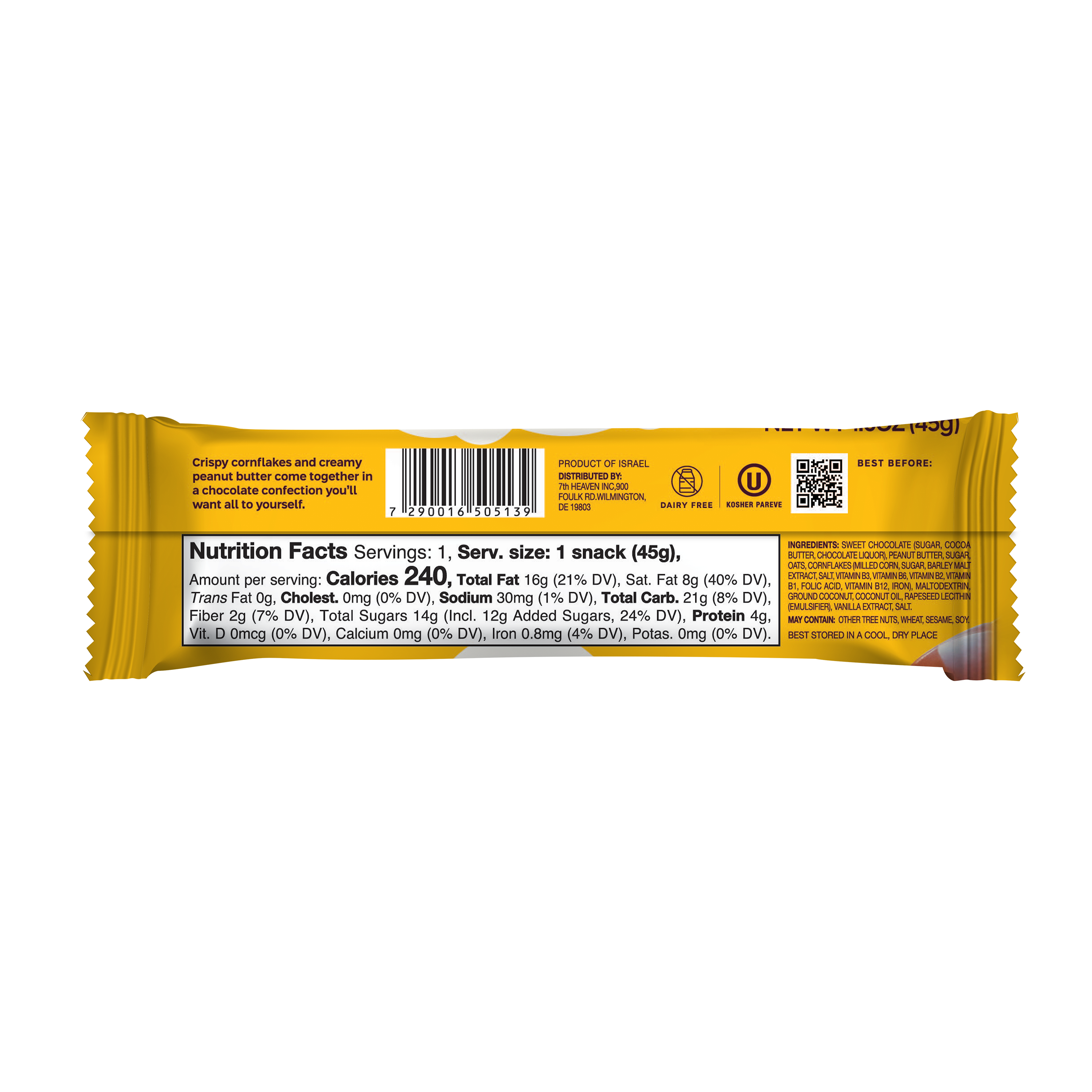Sweet Chocolate (Sugar, Cocoa Butter, Chocolate Liquor), Peanut Butter, Sugar, Oats, Cornflakes (Milled Corn, Sugar, Barley Malt Extract, Salt, Vitamin B3, Vitamin B6, Vitamin B2, Vitamin B1, Folic Acid, Vitamin B12, Iron),Maltodextrin, Ground Coconut, Coconut Oil, Rapeseed Lecithin (Emulsifier), Vanilla Extract, Salt